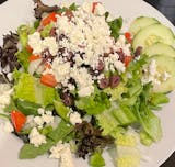Organic mixed greens, Roma tomatoes, green peppers, cucumbers, Kalamata olives, onions, pepperoncini, and feta cheese. Includes (2) 2 oz salad dressings on the side.