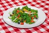 Organic mixed greens, Roma tomatoes, green peppers, cucumbers, olives, pepperoncini, onions. Includes (2) 2 oz salad dressings on the side.